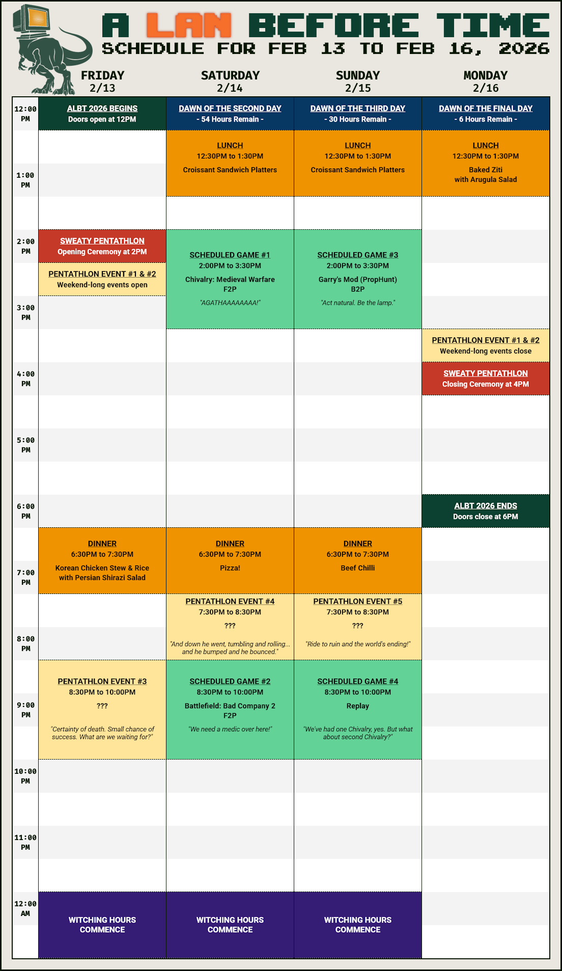 Here’s everything you need to know about A LAN BEFORE TIME before you plug in. We’ve compiled all the details to ensure your weekend runs as smoothly as your frame rate. From what to eat to where to park, here is the full breakdown for the main event.